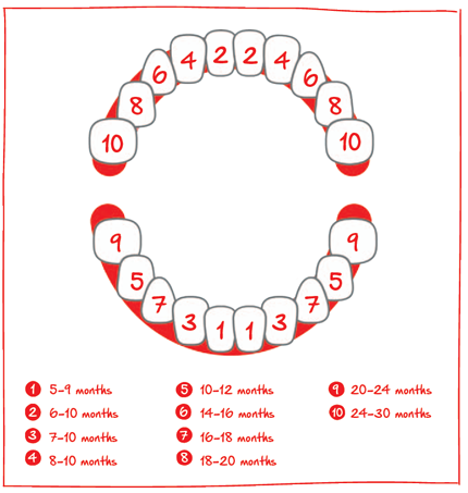 寶寶長出第一顆牙齒後,剩下的十九顆牙就會按部就班地出現。大部分的小孩在三歲之前乳牙幾乎都會長齊。只要發現寶寶嘴裡剛露出第一顆小小的牙齒,即可開始每日為寶寶養成刷牙的習慣。別理會寶寶一時的不耐和抗議,因為這是必須的牙齒保健。