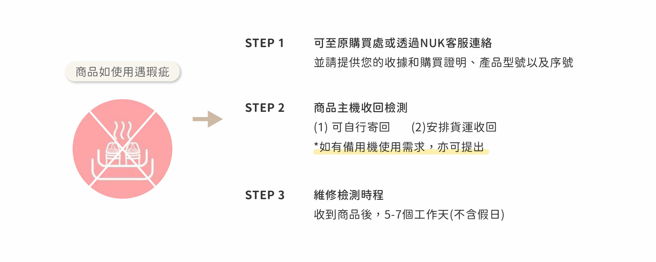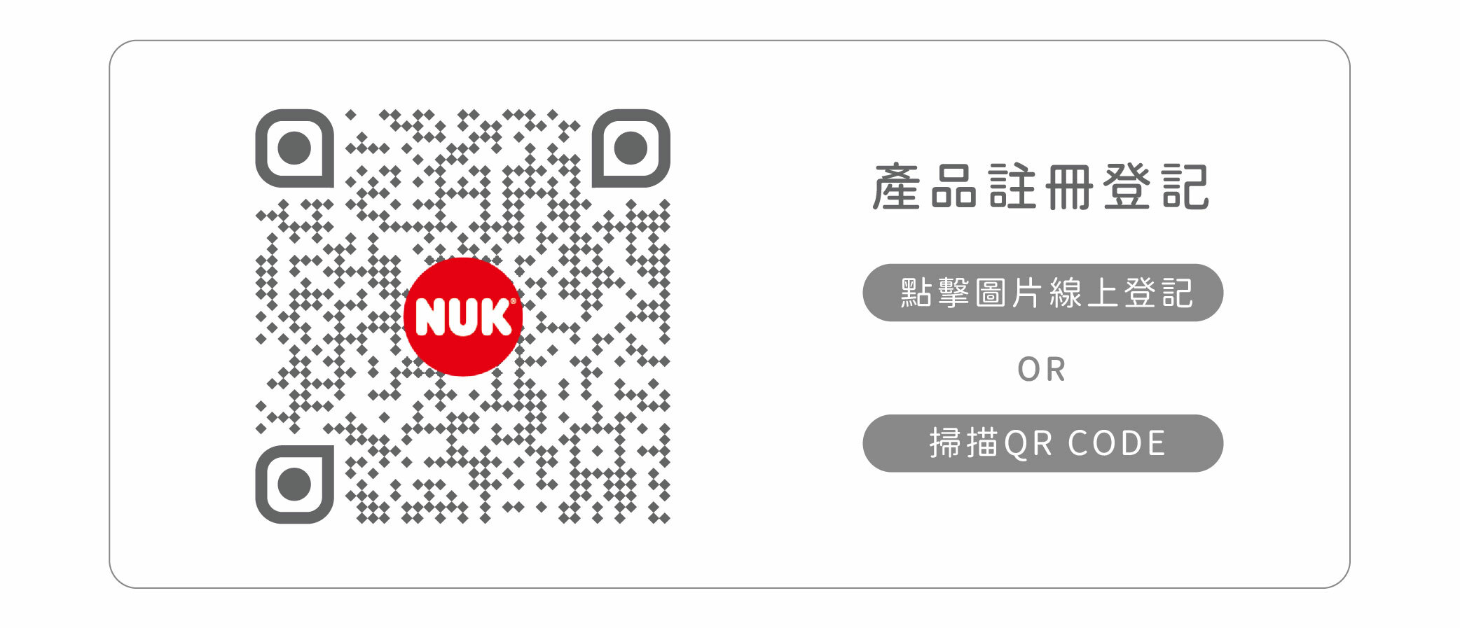 感謝您購買NUK商品,凡於本公司特約經銷門市購買之指定商品,並持有產品保固服務卡,請於購買一個月內進行「線上註冊登記保固」將您所購買的NUK商品資料登錄,以享有完整售後保固的服務。