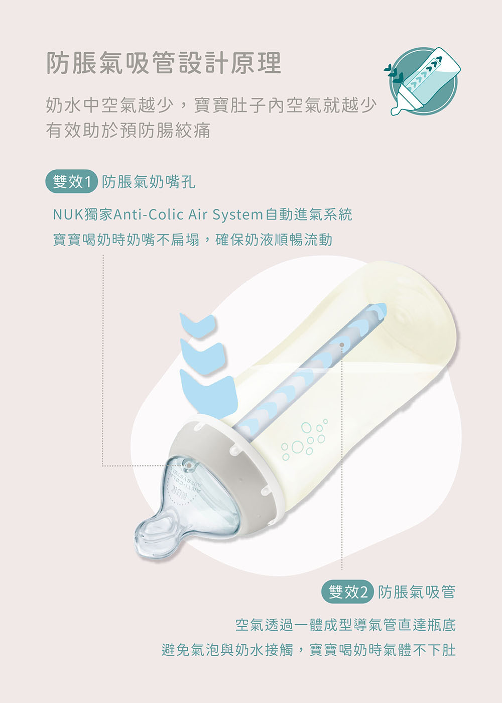 雙效(1)-防脹氣奶嘴孔:Anti-Colic Air System自動進氣系統,確保奶液順暢流動