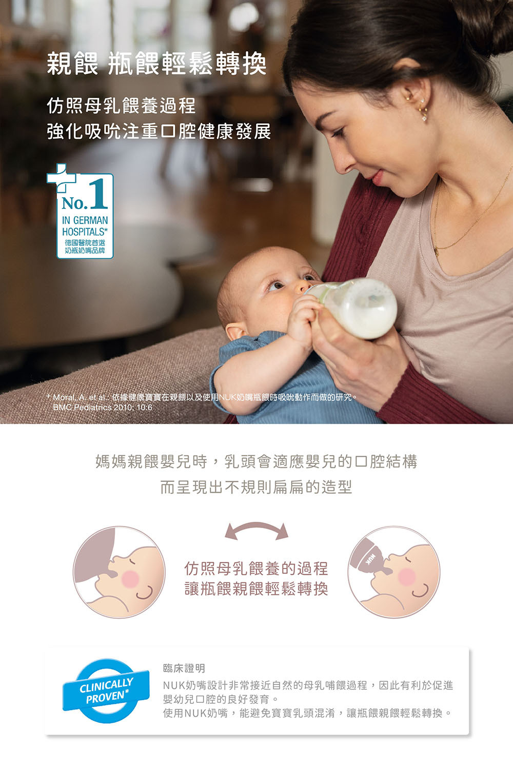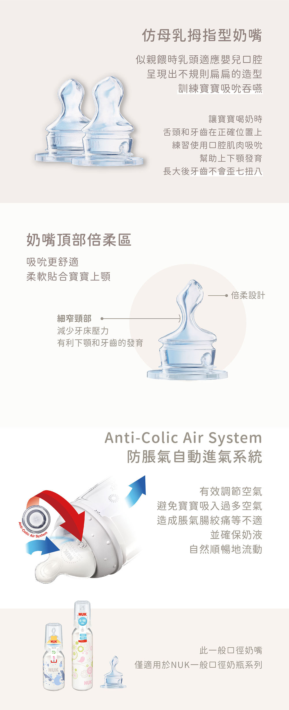 仿母乳拇指型奶嘴,仿照母乳餵養過程設計,讓寶寶瓶餵親餵輕鬆轉換不怕乳頭混淆,強化吸吮吞嚥注重口腔健康發展,獨家專利Anti-Colic Air System自動進氣系統,有效調節空氣避免脹氣、腸絞痛