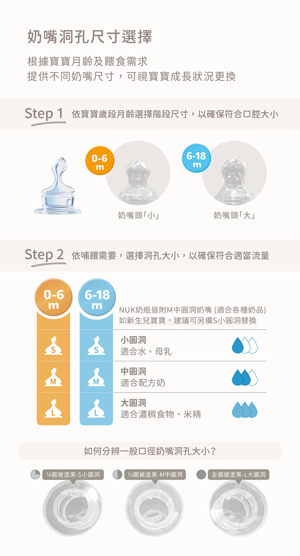 可依照餵食需求,選擇奶嘴洞孔大小,以確保符合適當流量