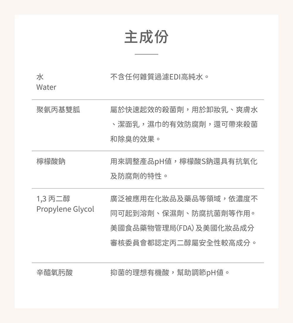 水、1,3丙二醇、聚氨丙基雙胍、檸檬酸鈉、 辛醘氧肟酸 |