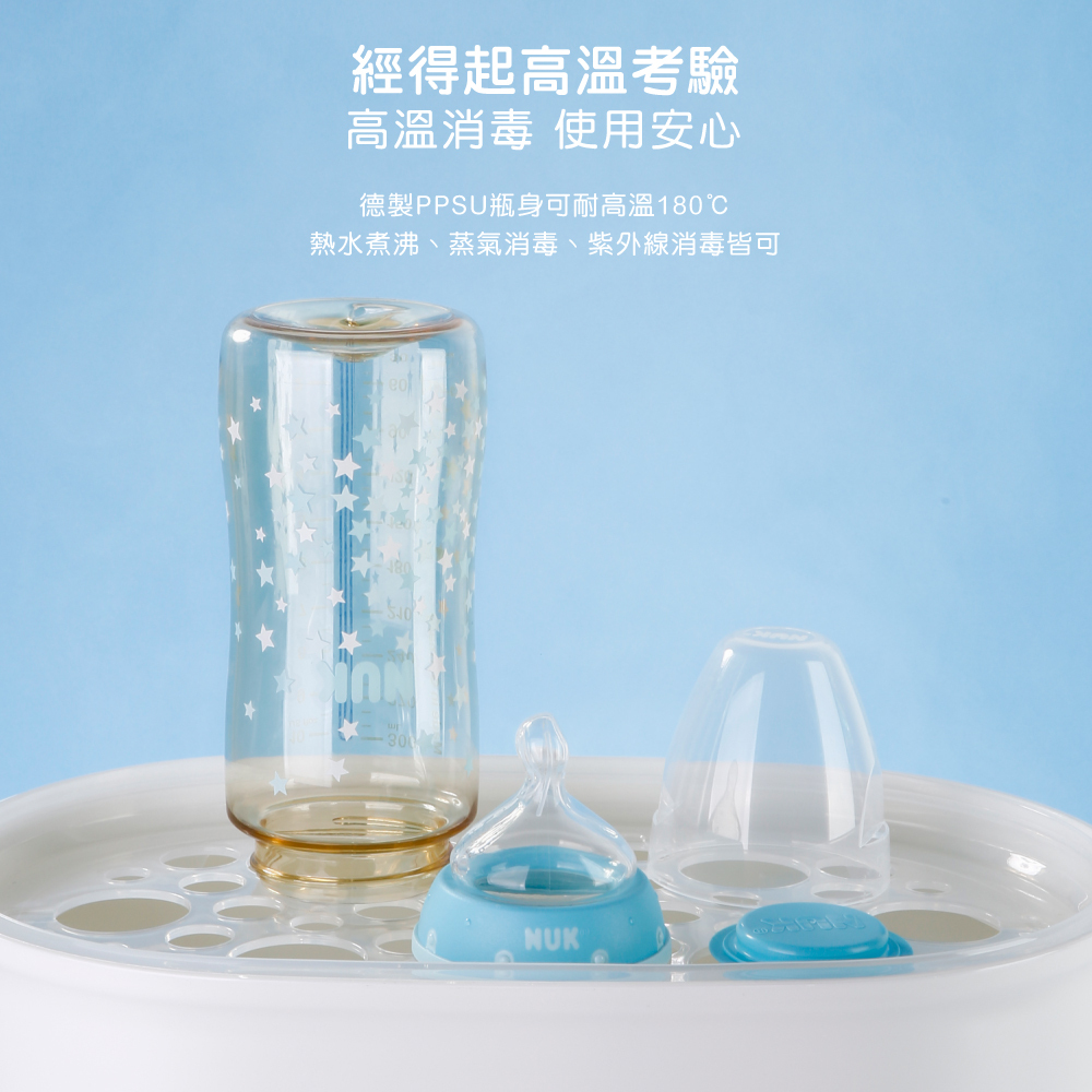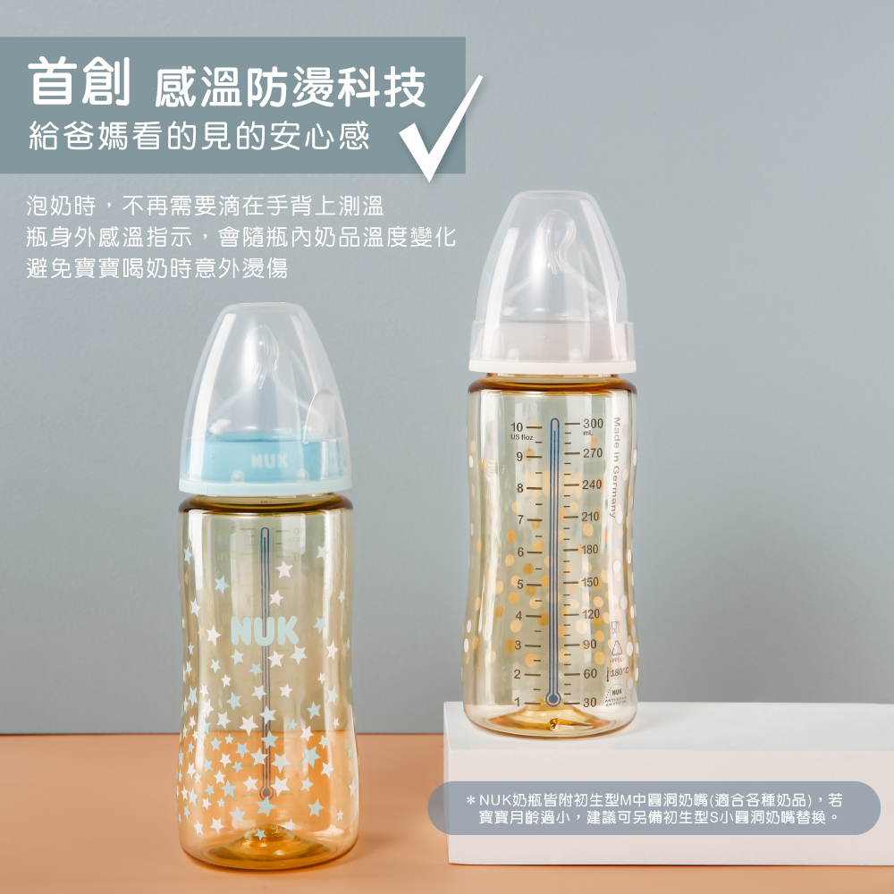 | 內容物 | 寬口徑PPSU感溫奶瓶300mL,附0-6m/M中圓洞奶嘴x1 |
