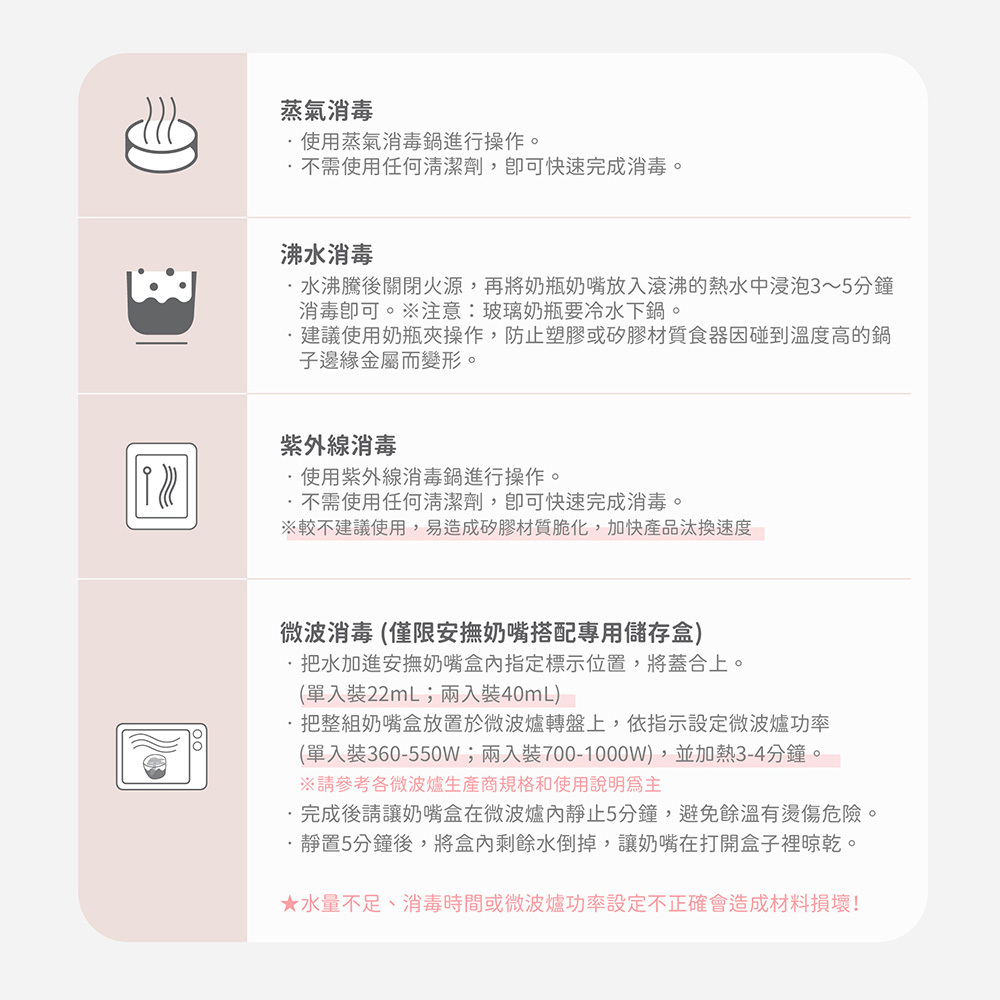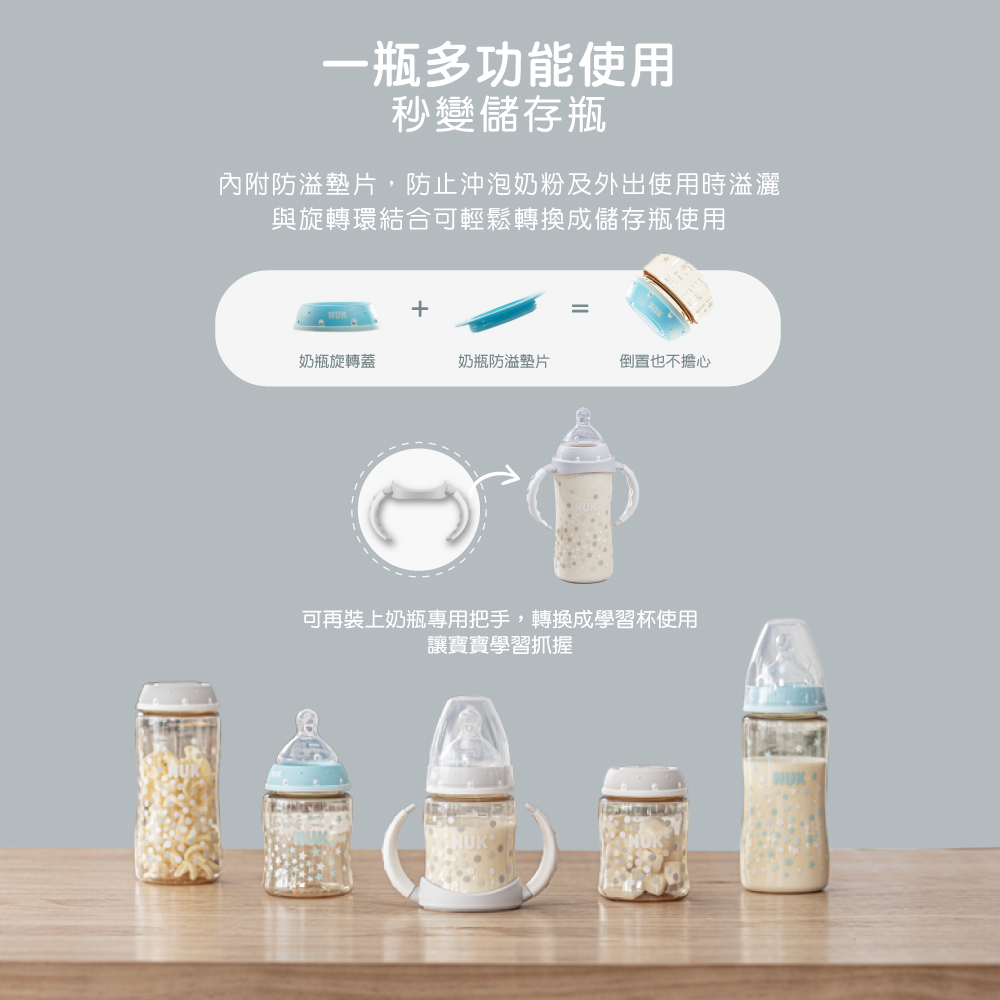 | 主要材質/耐熱溫度 | 奶瓶蓋、旋轉蓋、防溢墊片:PP聚丙烯/100℃ |