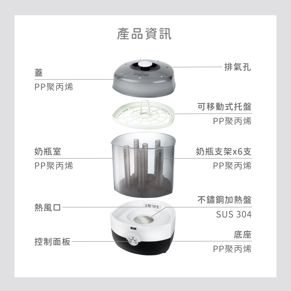 | 主要材質/耐熱溫度 | 奶瓶蓋、旋轉蓋、防溢墊片:PP聚丙烯/100℃ |