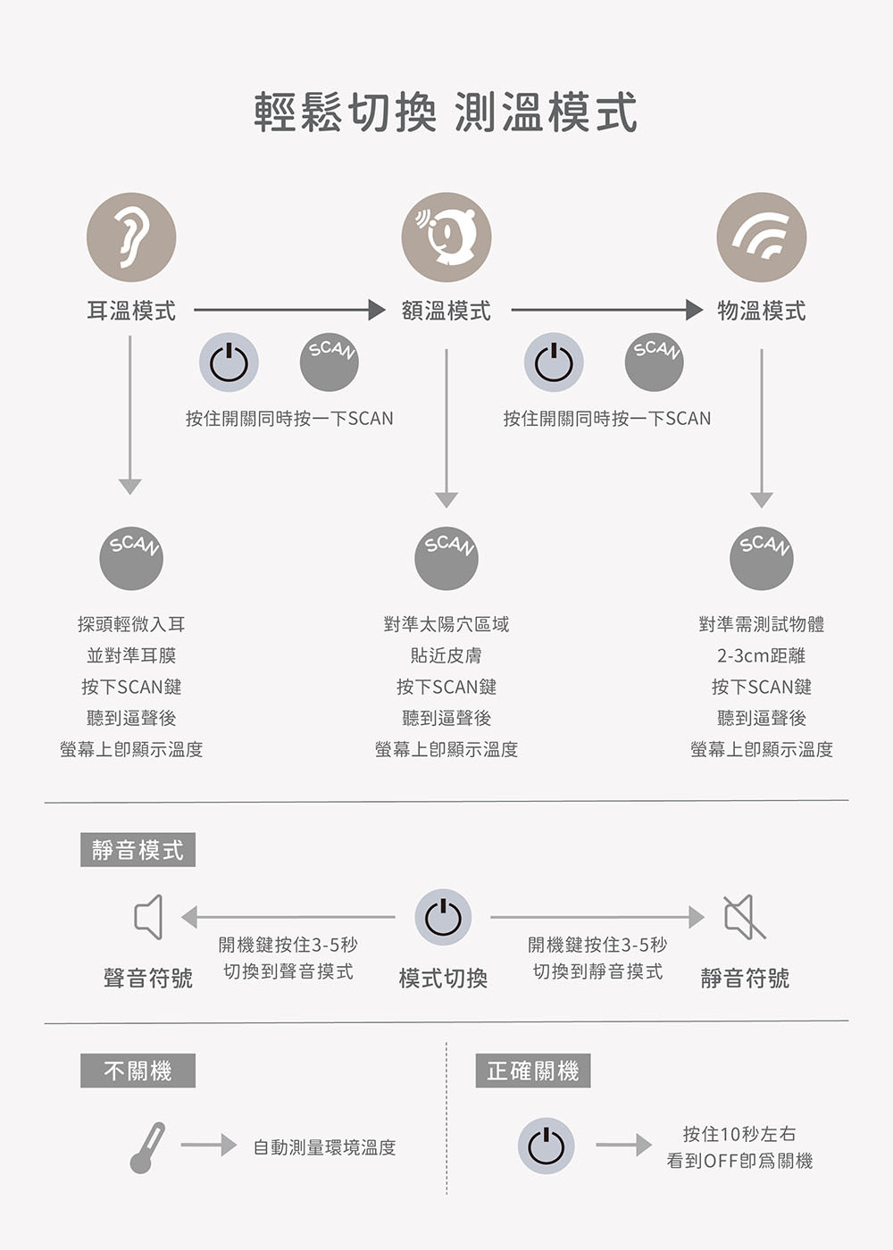 ‧ 輕鬆變換耳溫、額溫、表溫模式