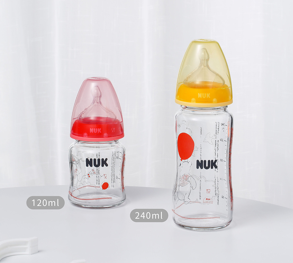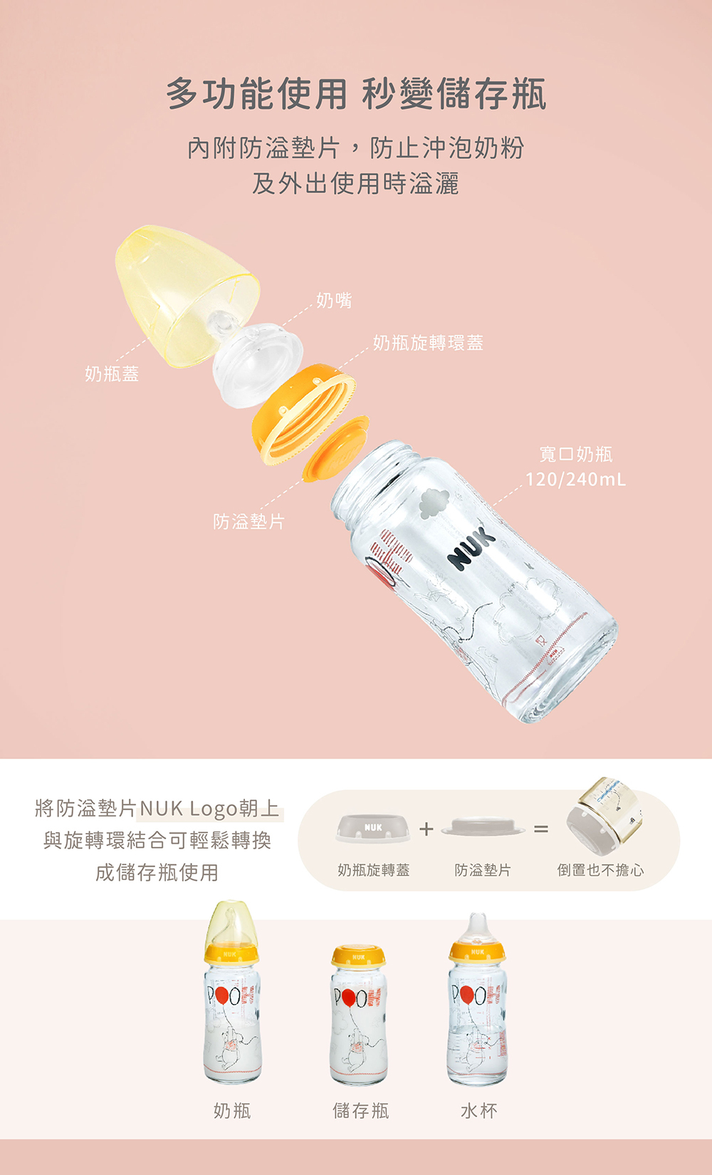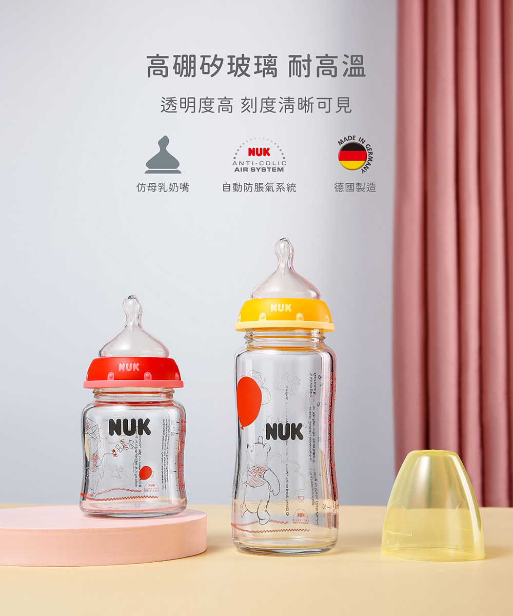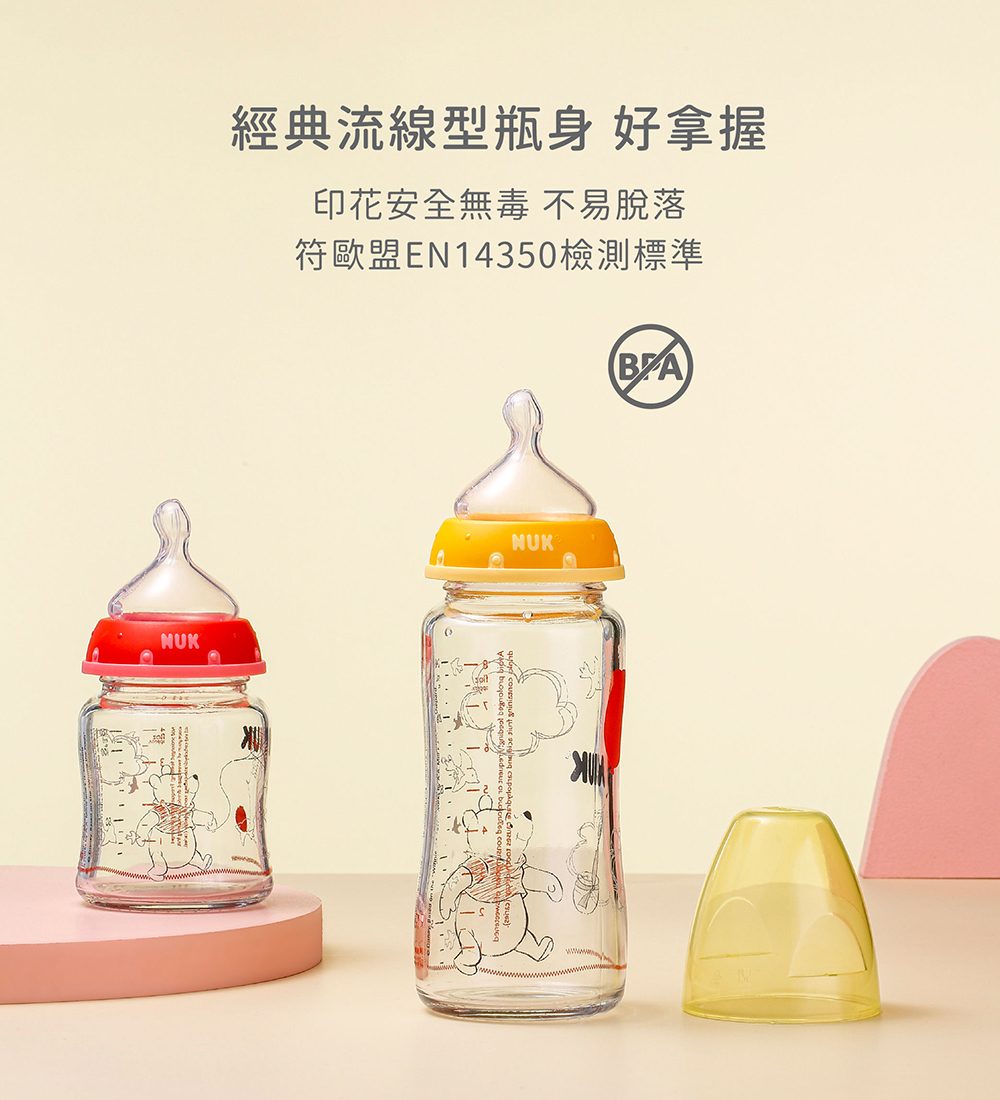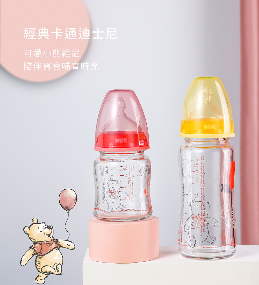 迪士尼聯名款高硼矽寬口玻璃奶瓶耐高溫,德國精緻工藝流線型瓶身好拿握,搭配仿母乳拇指型防脹氣奶嘴,瓶餵親餵輕鬆轉換不怕乳頭混淆,內附防溢墊片多功能設計,更貼近生活化使用,可愛小熊維尼陪伴寶貝哺育時光