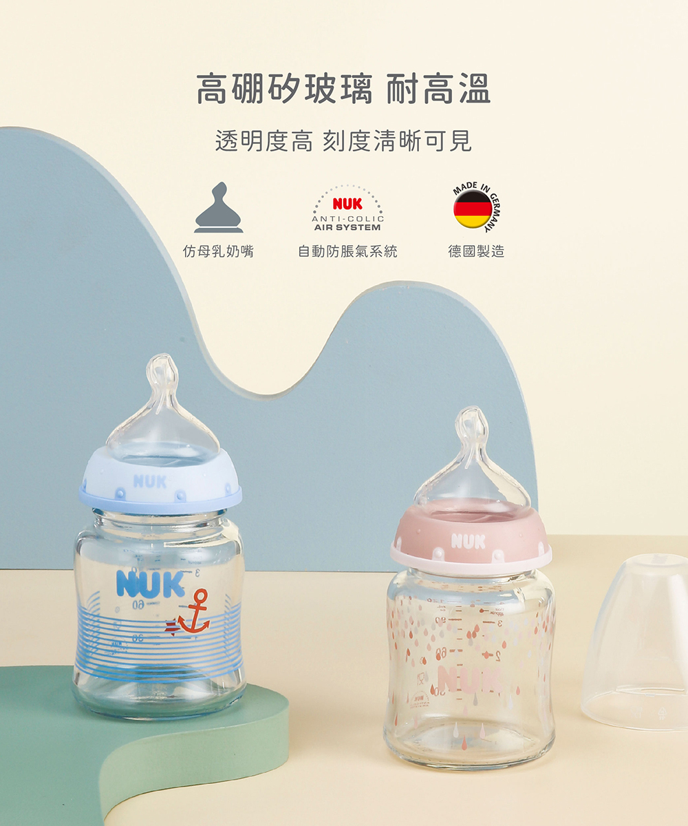 *NUK奶瓶內附M中圓洞奶嘴,新生兒建議可備S小圓洞替換