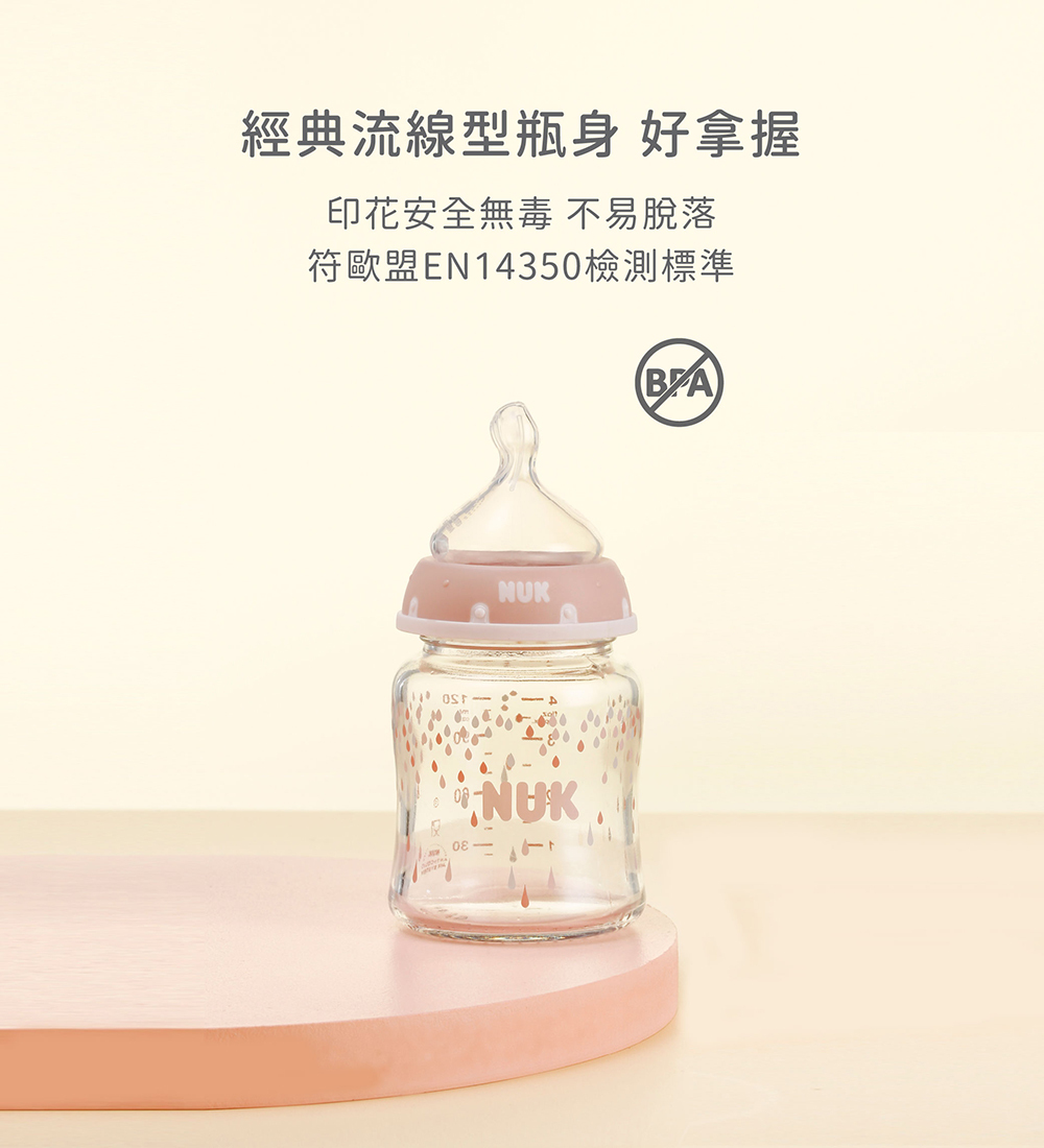 NUK經典款高硼矽寬口玻璃奶瓶耐高溫,德國精緻工藝流線型瓶身好拿握,搭配仿母乳拇指型防脹氣奶嘴,瓶餵親餵輕鬆轉換不怕乳頭混淆,內附防溢墊片多功能設計,更貼近生活化使用,為寶貝哺育時光帶來美好體驗