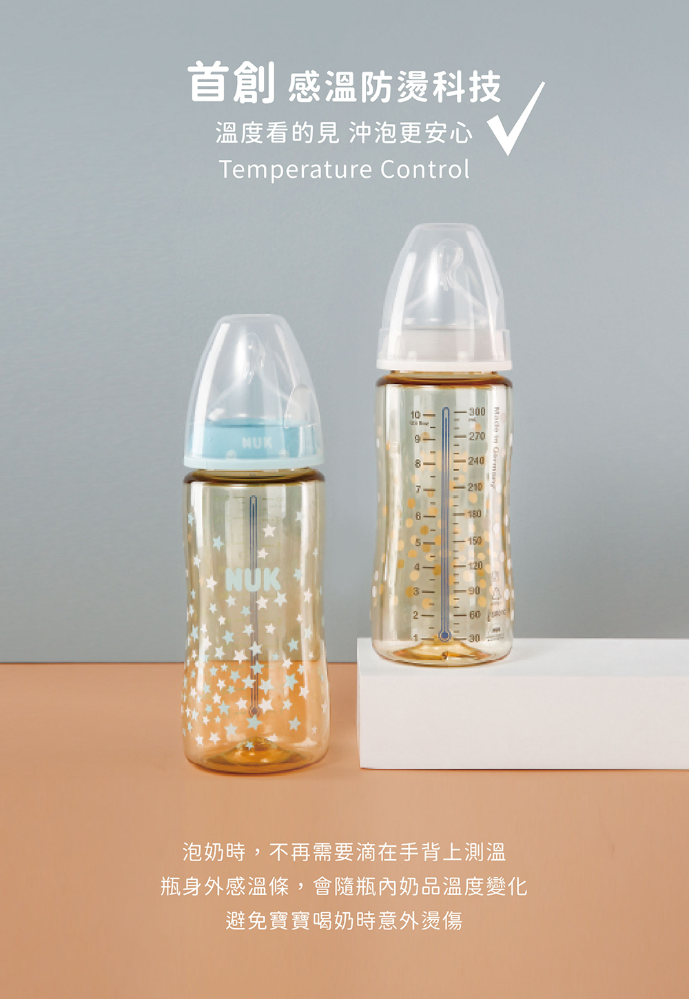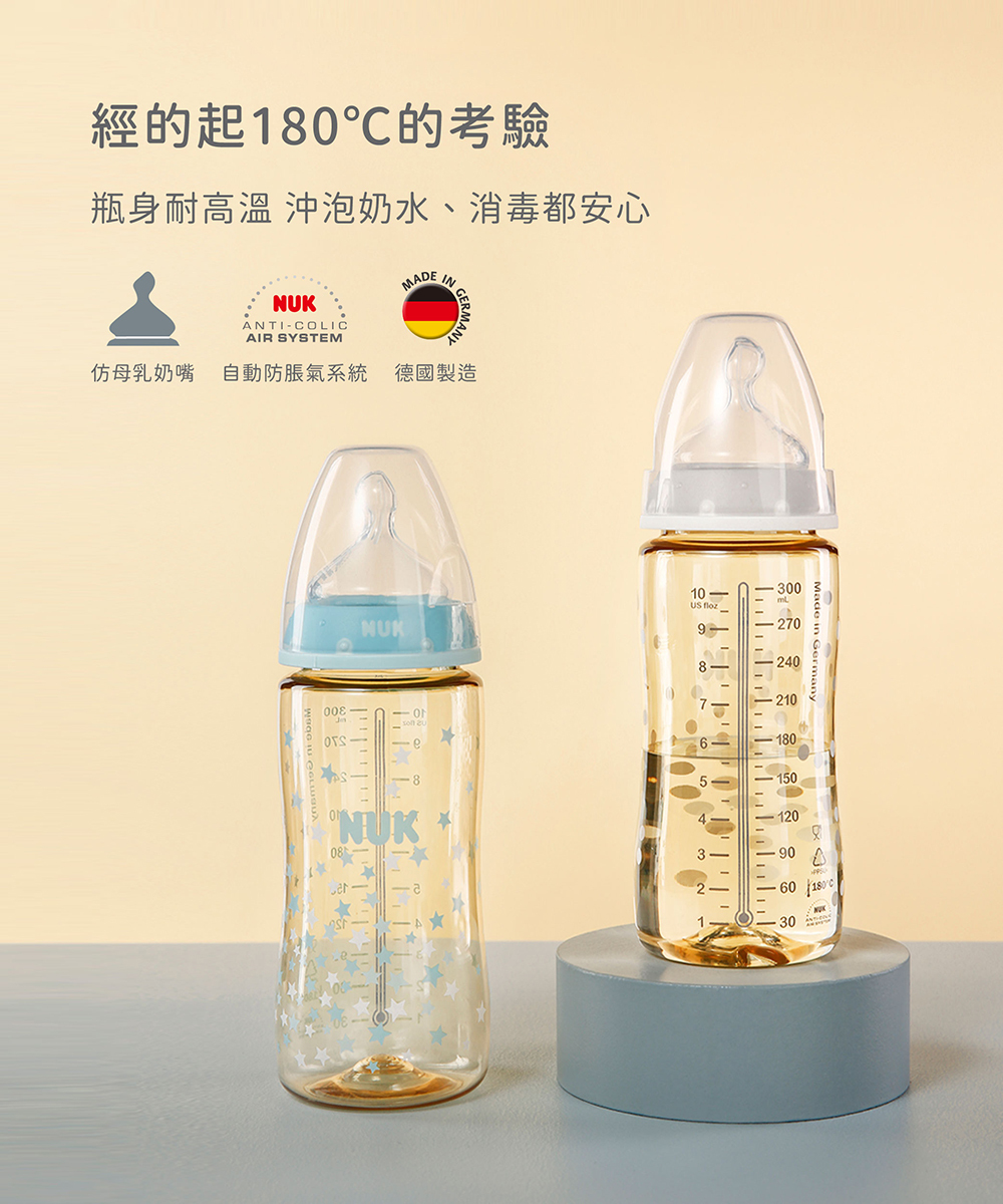 *NUK奶瓶內附M中圓洞奶嘴,新生兒建議可備S小圓洞替換