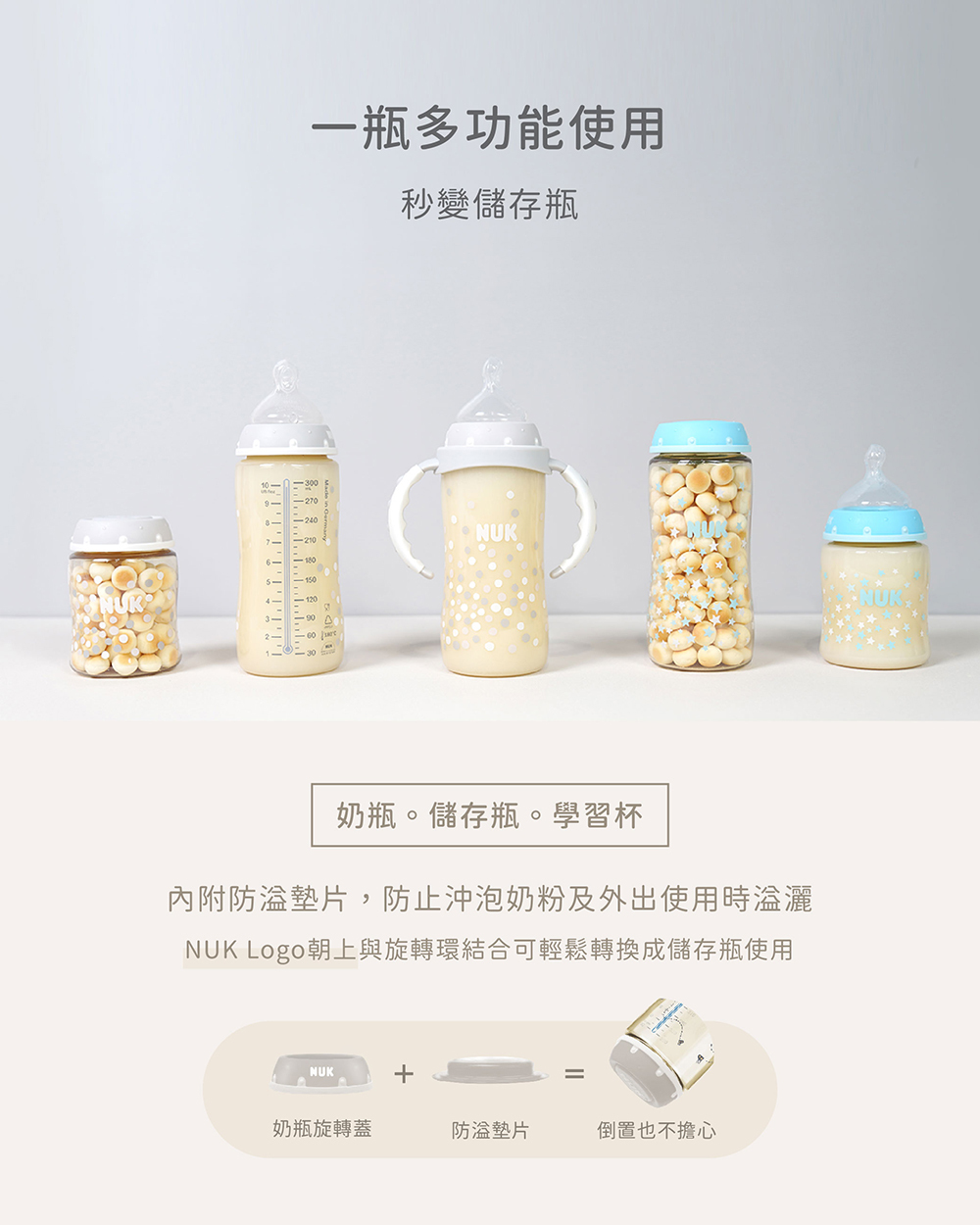 | 主要材質/耐熱溫度 | 奶瓶蓋、旋轉蓋、防溢墊片:PP聚丙烯/100℃ |
