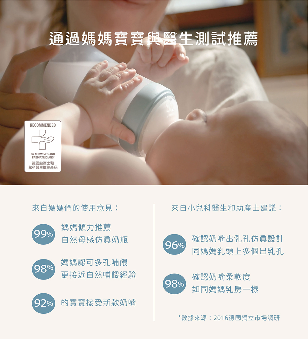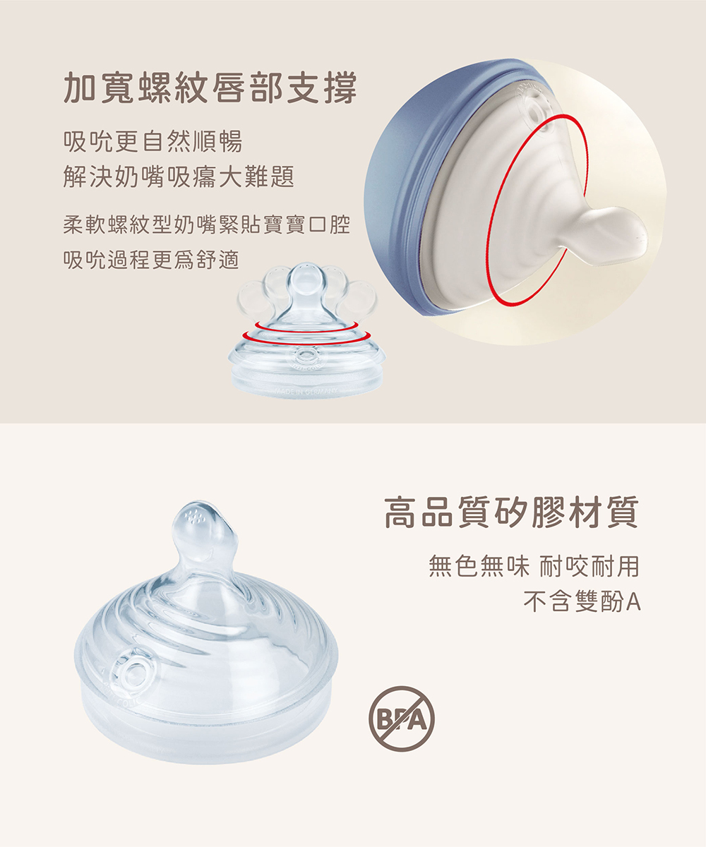 親餵媽媽偶爾需要瓶餵支援!自然母感系列多個仿生出乳孔奶嘴,模擬母乳真實生理構造,螺紋型柔軟奶嘴緊貼寶寶口腔,更像媽媽乳房讓寶寶順利銜接母乳餵養