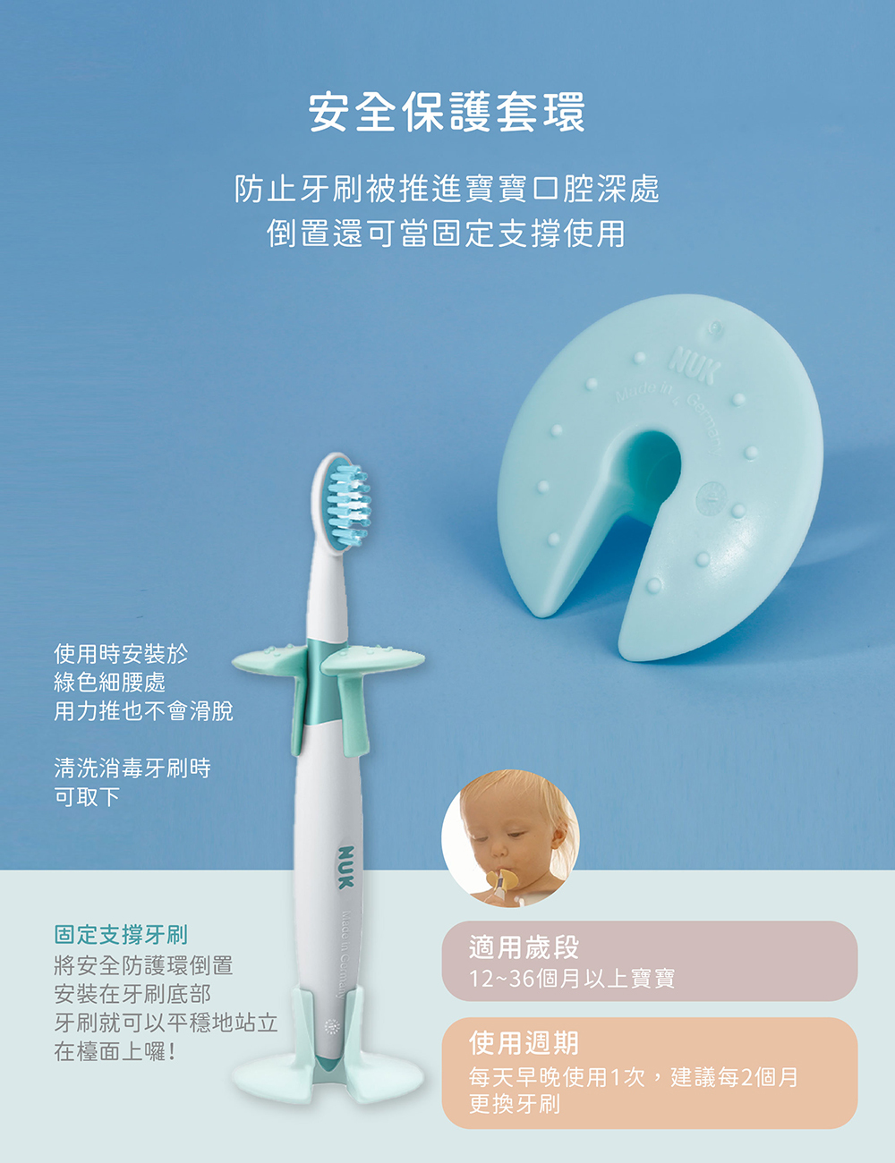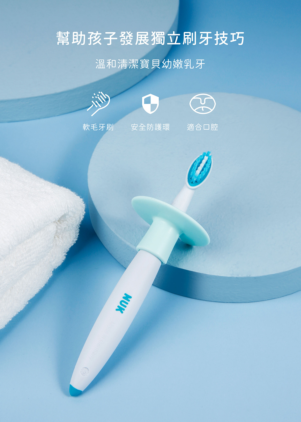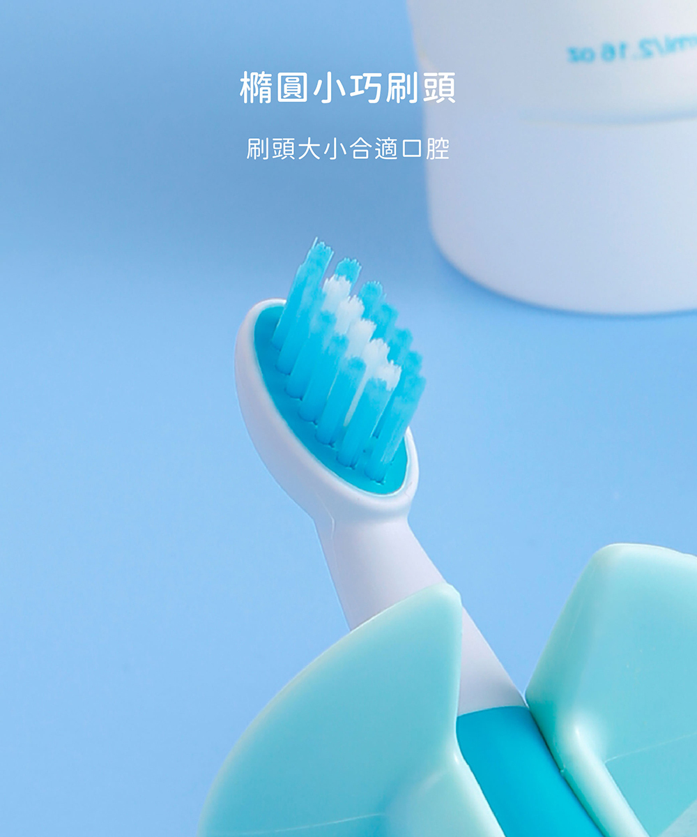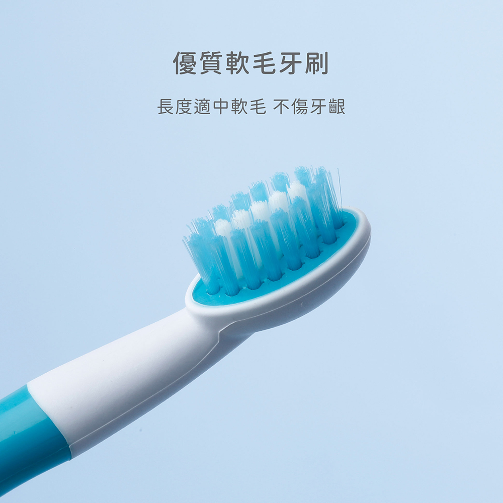 教導孩子獨立刷牙的理想工具,軟毛刷頭溫和清潔和按摩孩子的牙齦,保護環防止牙刷推進口腔深處。