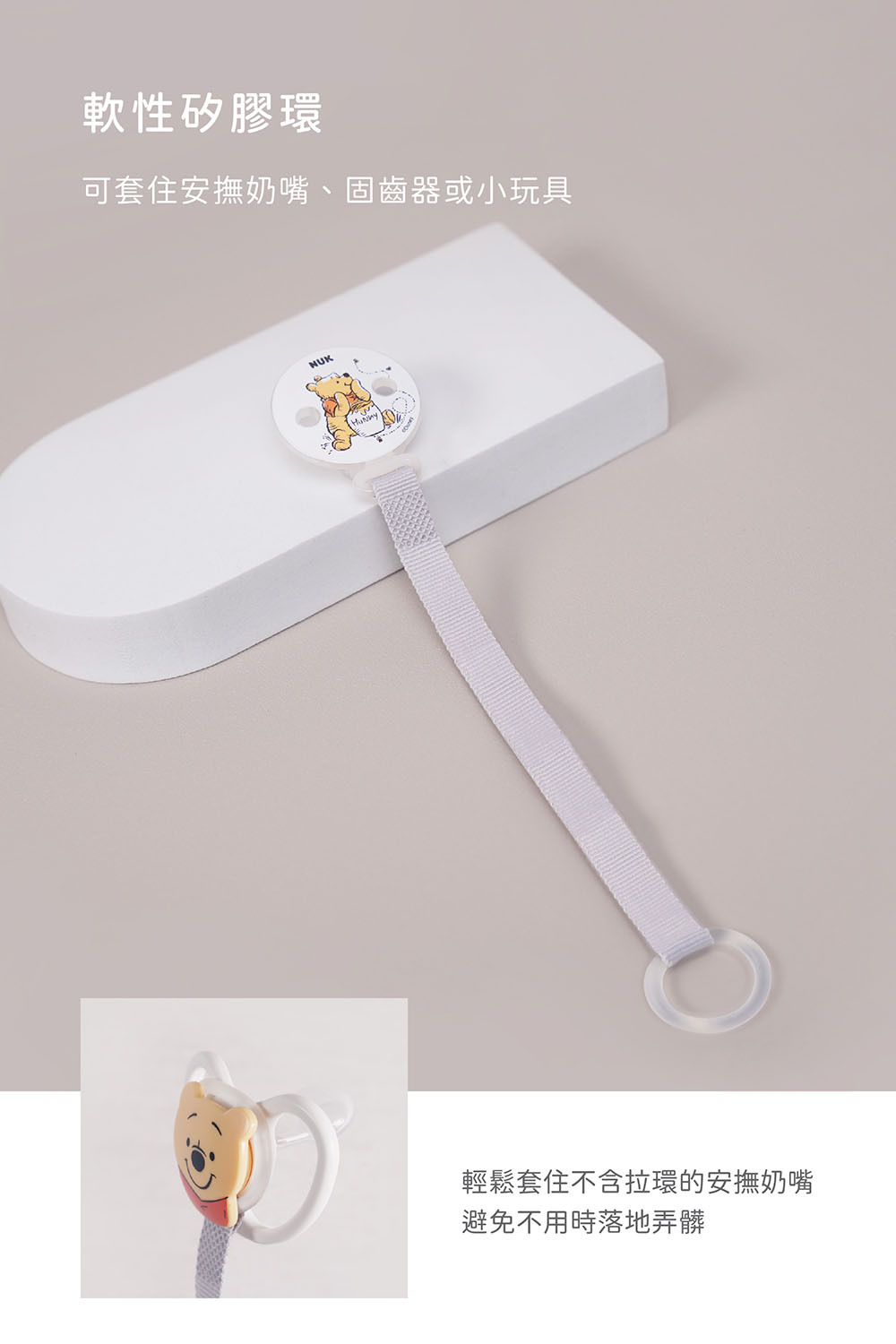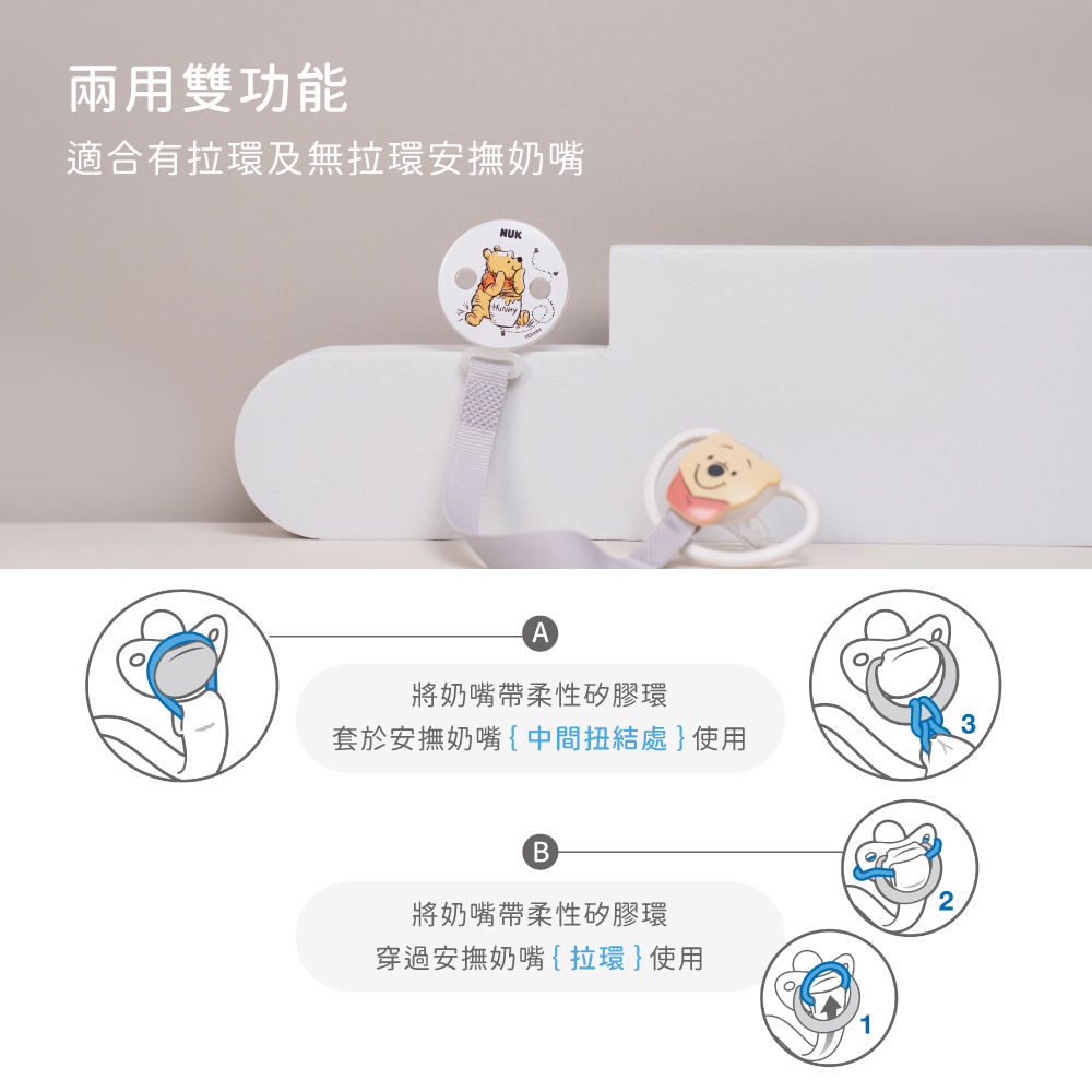 迪士尼授權款2 IN 1雙功能安撫奶嘴帶,帶柔性矽膠環,可以單手打開和關閉的夾扣,無粗糙的邊緣弄傷嬰孩,好扣好安裝,鈕扣由Tritan材料製成,結合了優質的紡織布料並搭配高品質印刷,與NUK安撫奶嘴系列相匹配的時尚設計