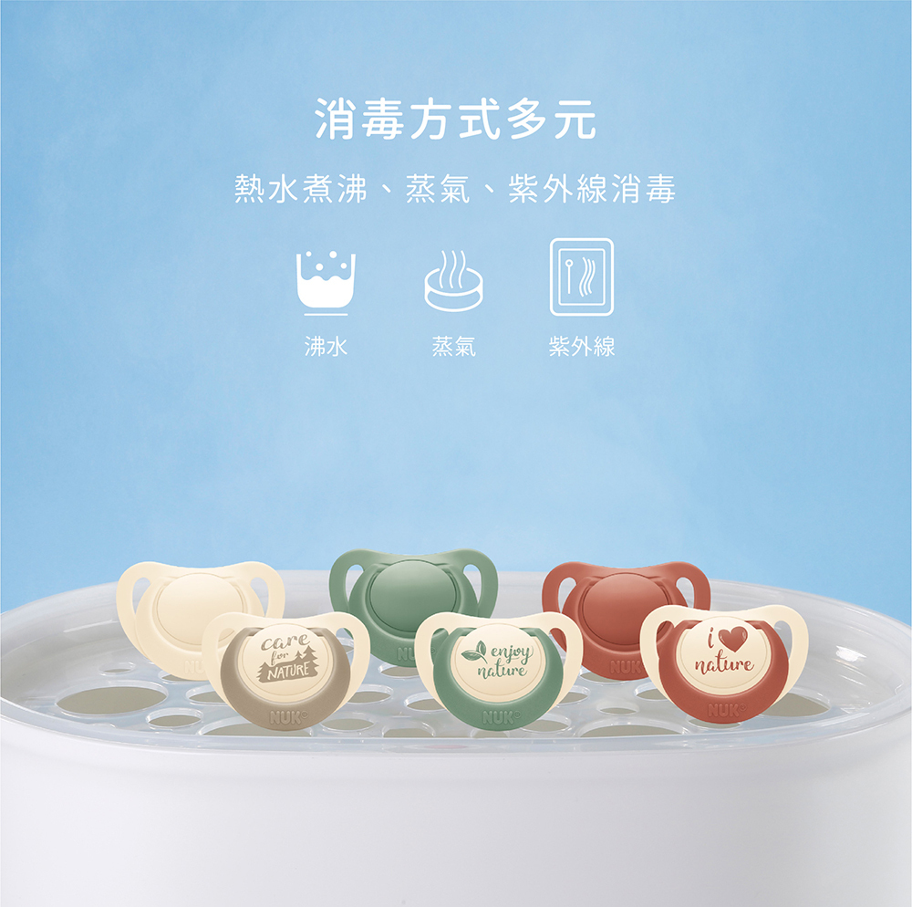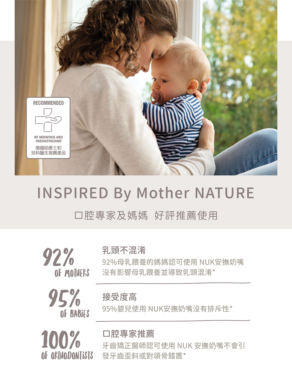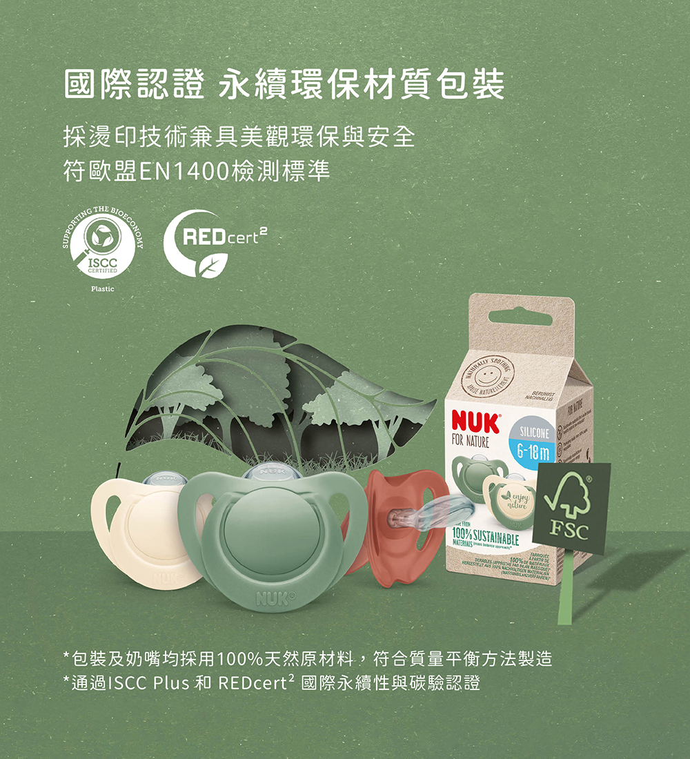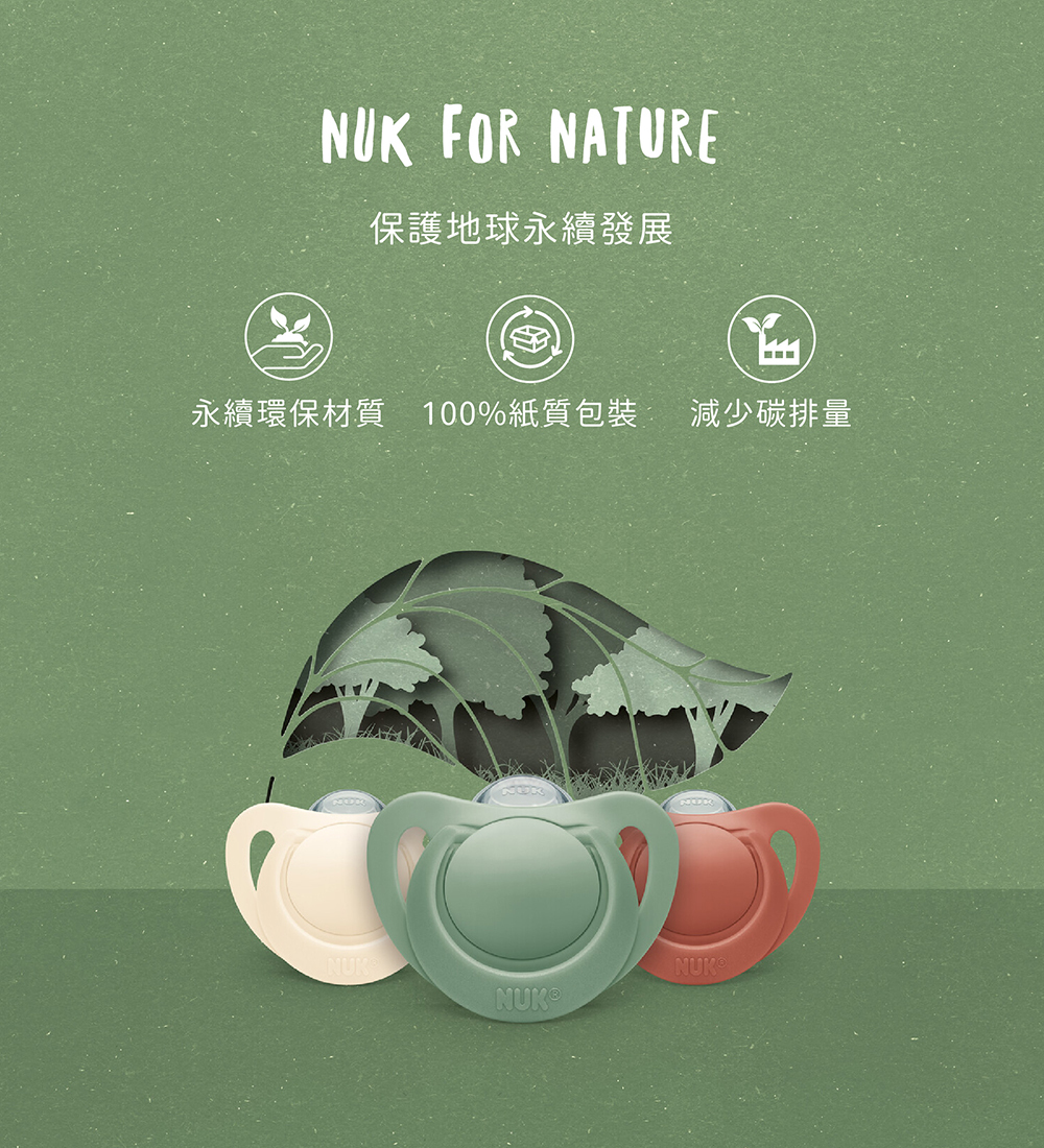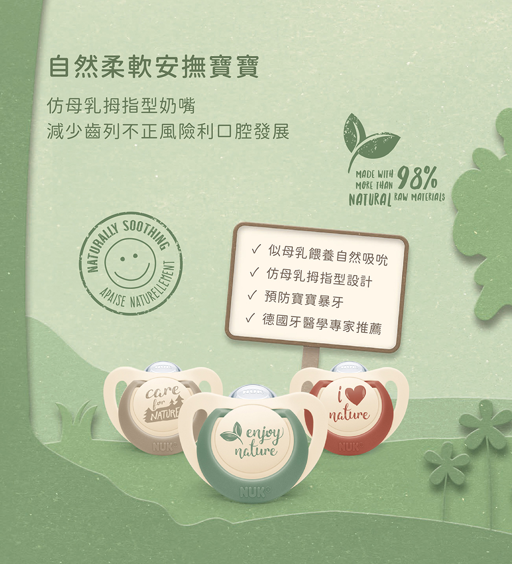 NUK For Nature 質感莫蘭迪色系,全新環保材質包裝,以98%天然原料符質量平衡方法製造,德國牙醫學專家研發推薦,仿母乳拇指型奶嘴設計訓練寶寶吸吮,減少齒列不正風險,滿足口慾期安撫需求,守護口腔健康發展外兼具環保工藝精神,保護地球永續發展