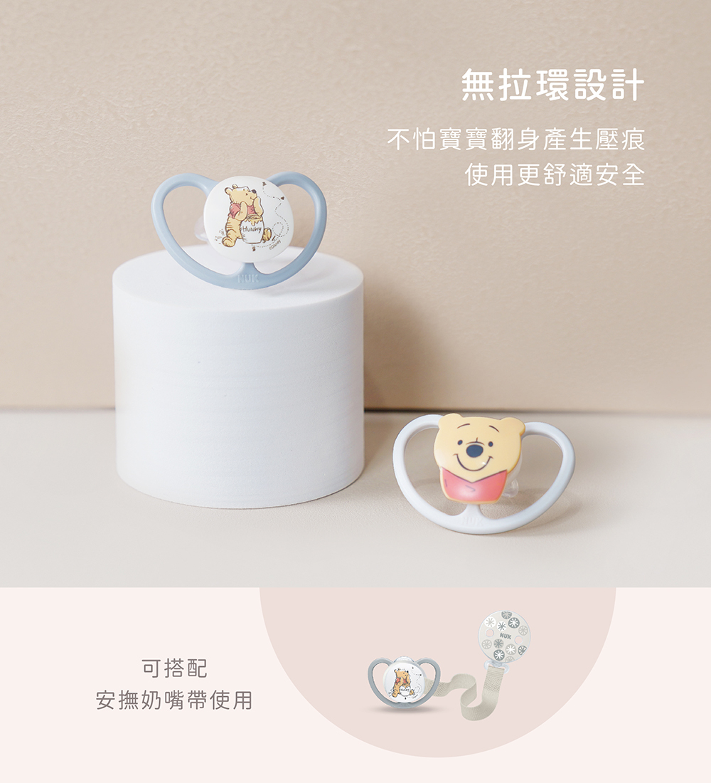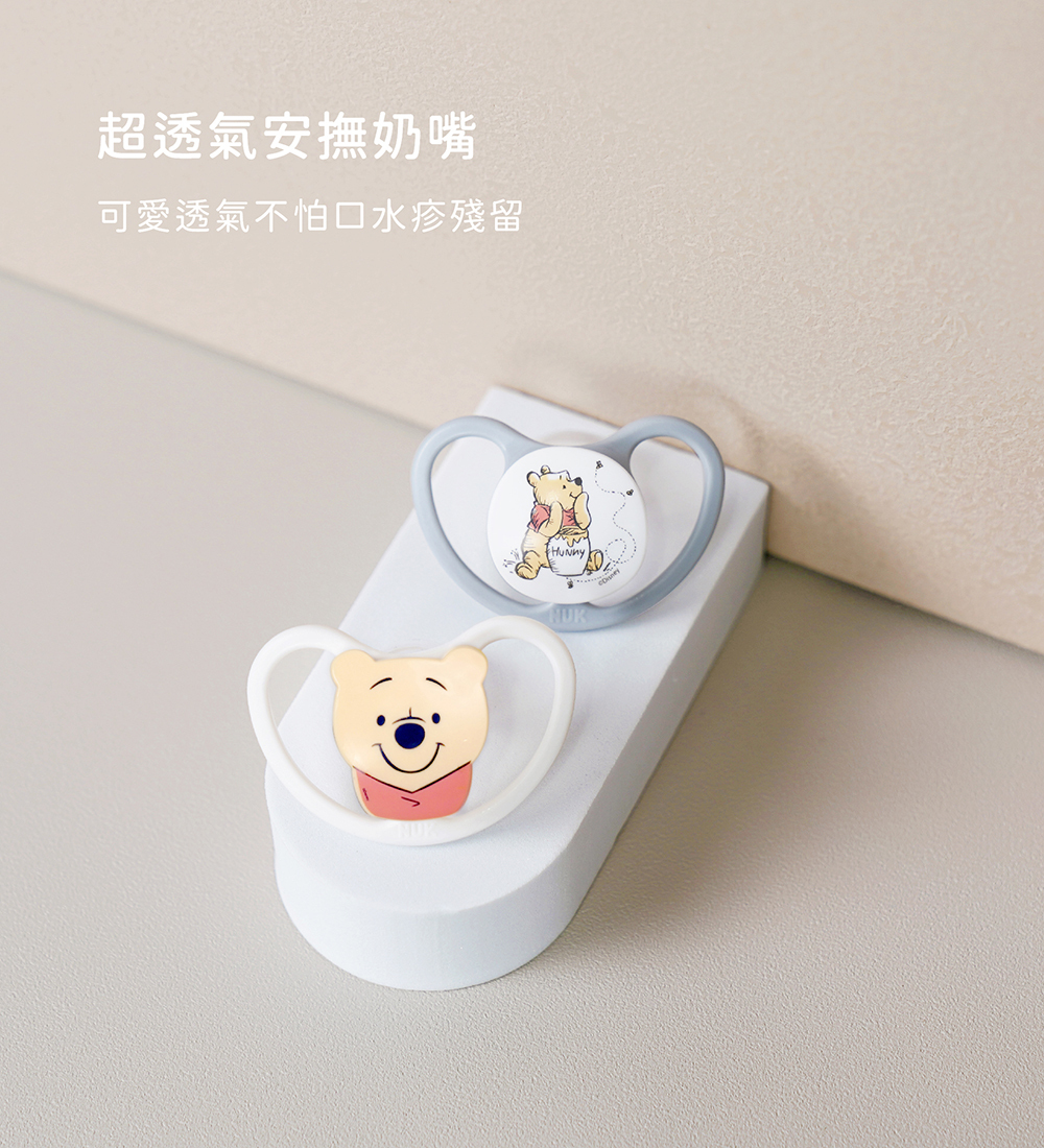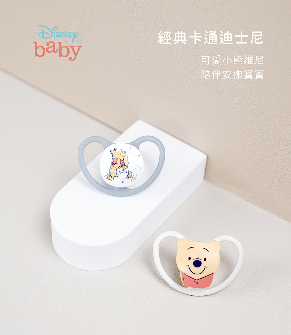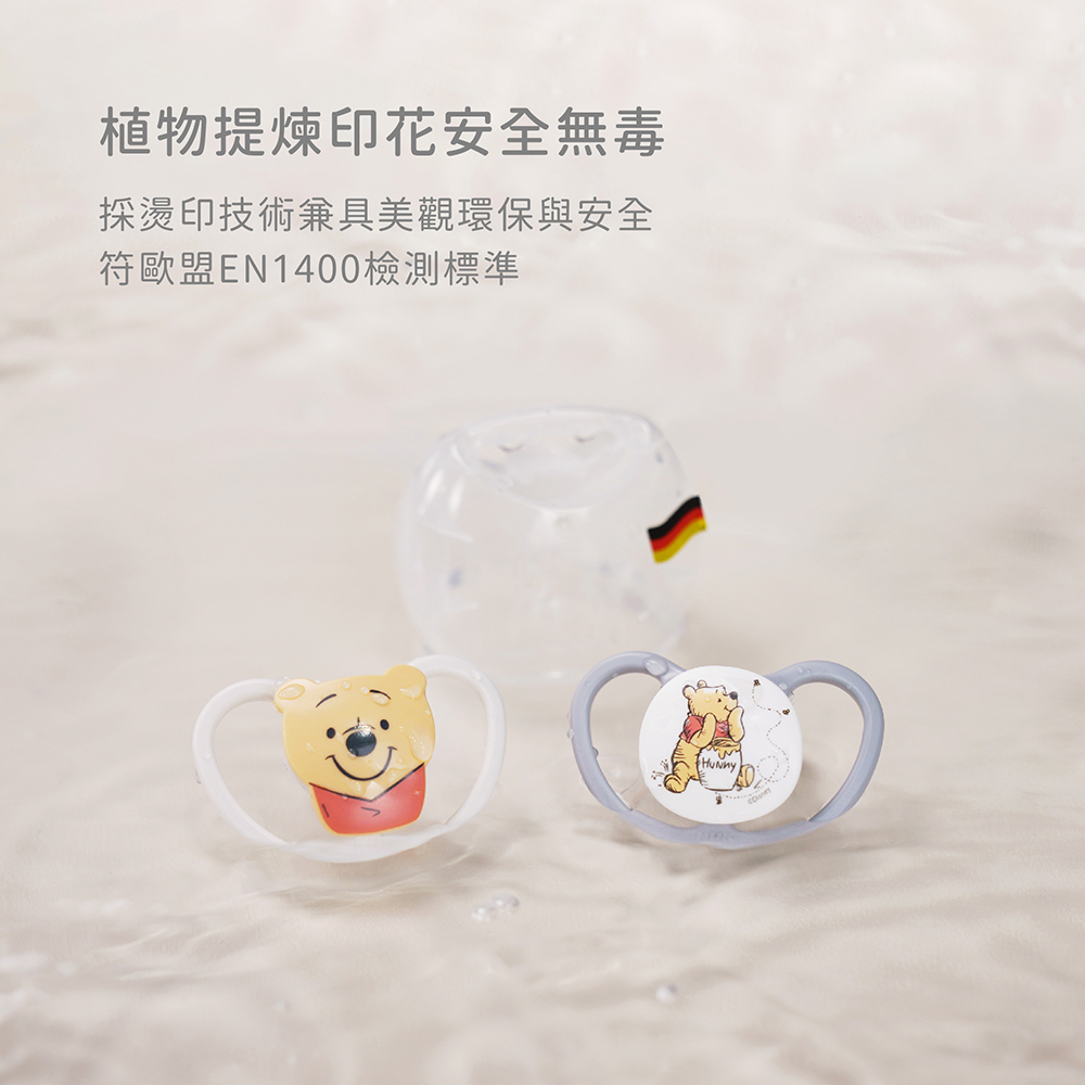 迪士尼授權款可愛安撫寶貝,搭配獨創超大透氣通風孔設計有效預防口水疹,德國牙醫學專家研發推薦,仿母乳拇指型奶嘴設計訓練寶寶吸吮,減少齒列不正風險,滿足口慾期安撫需求,不含雙酚A,貼心附防塵儲存盒,守護口腔健康發展