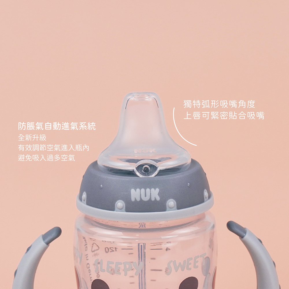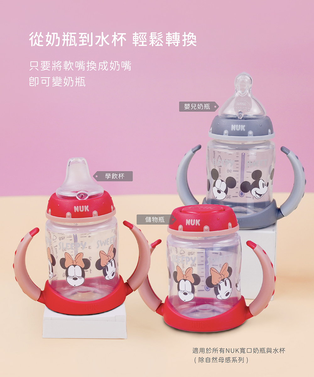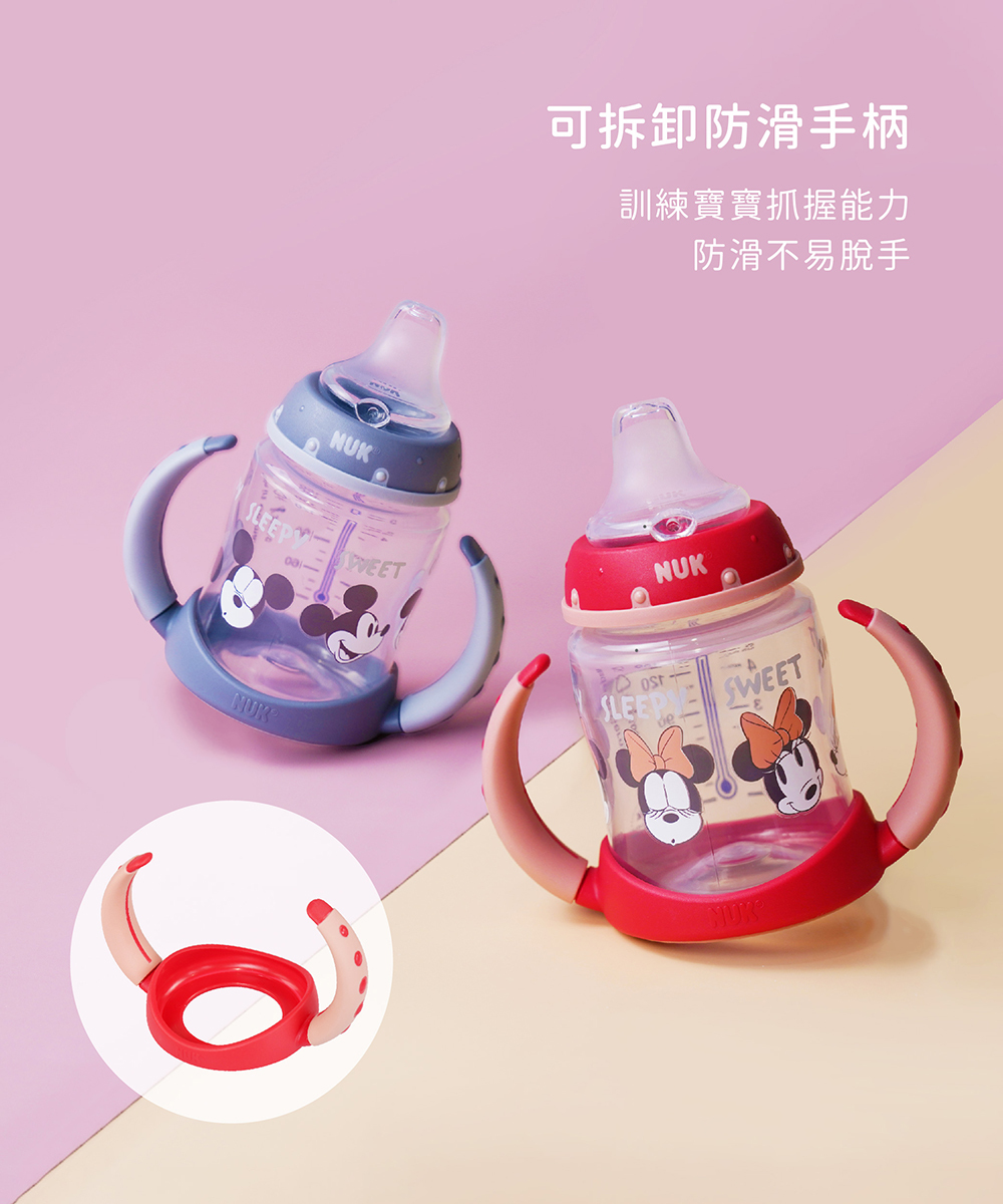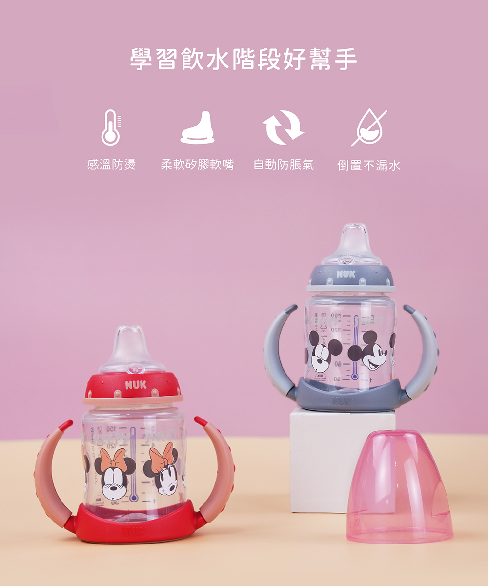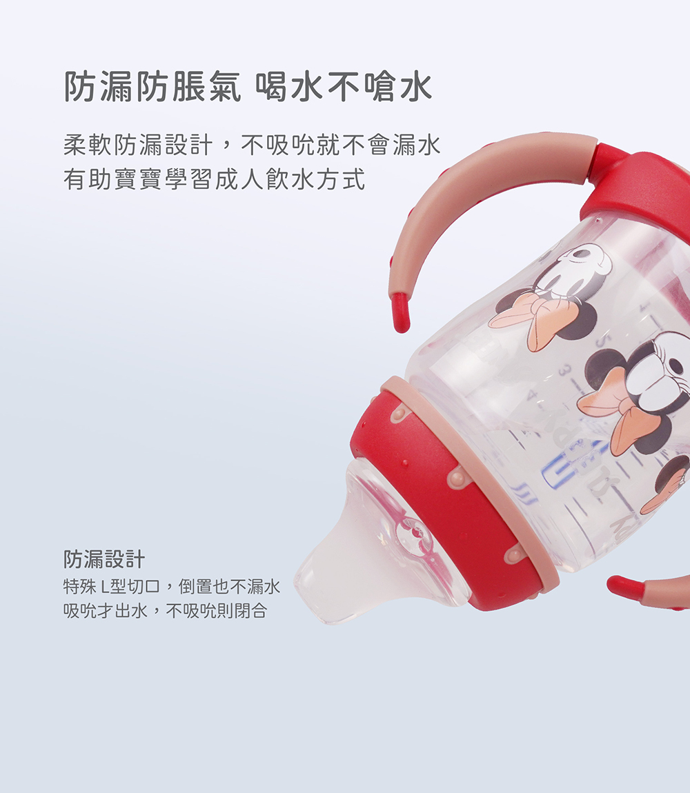 迪士尼米奇授權款學飲杯,寶寶學習喝水階段好幫手,雙柄設計可鍛鍊寶寶小手拿握,搭配L型特殊防漏設計不漏軟嘴,訓練吸吮倒放也不怕漏,奶瓶到水杯輕鬆轉換。