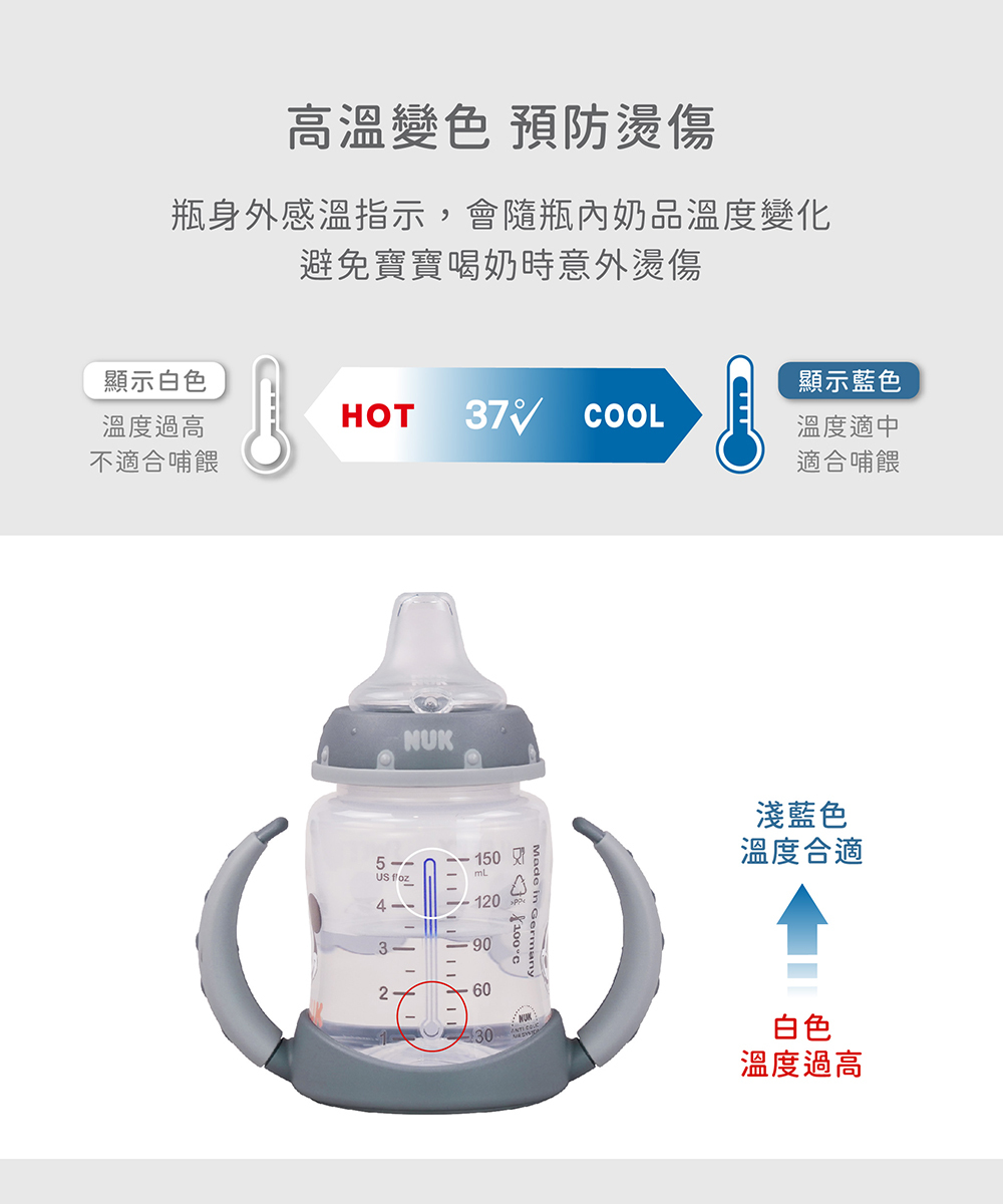 母嬰界首創感溫防燙科技「奶瓶界的Siri」瓶身感溫條智慧辨識奶水溫度,不怕給寶寶喝過熱或過冷奶水。
