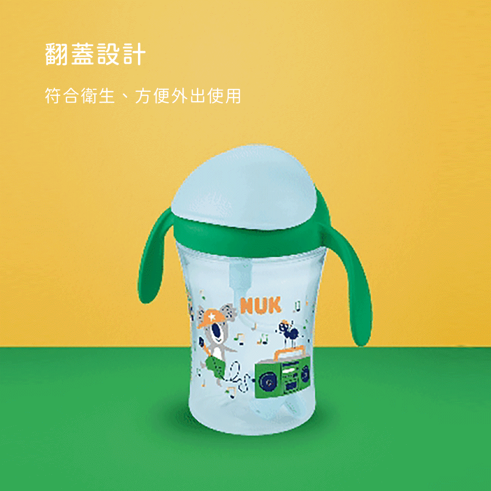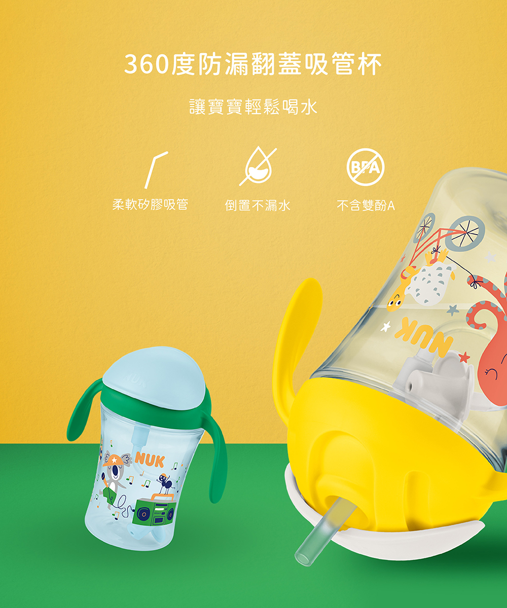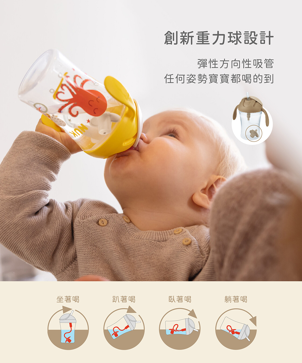 創新式喝水系統,彈性方向性吸管可隨液體移動,出水孔不受影響,不論任何姿勢與方向,幼童都可喝到飲品,具防漏潑灑功能