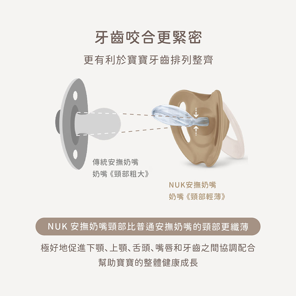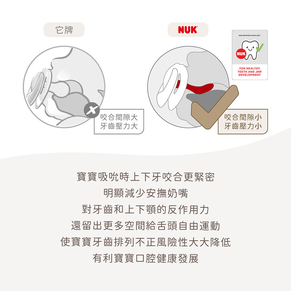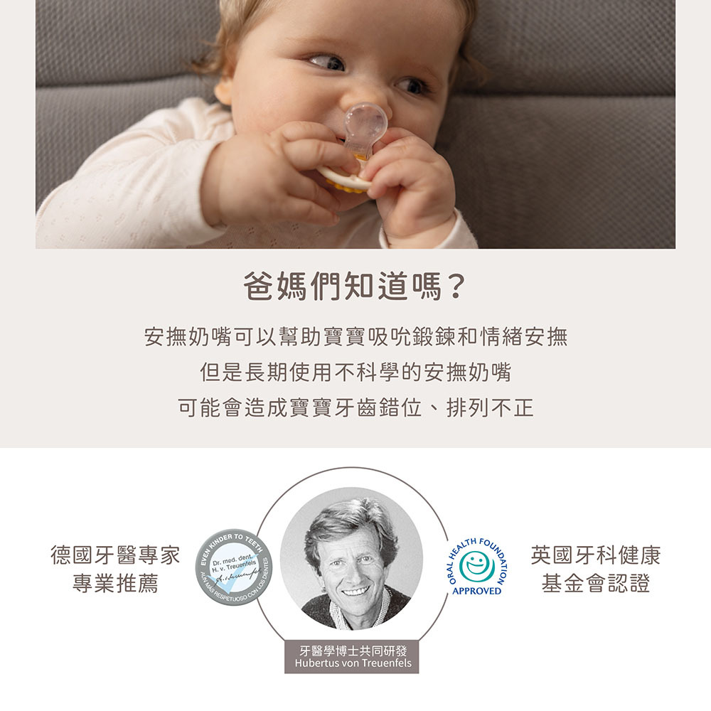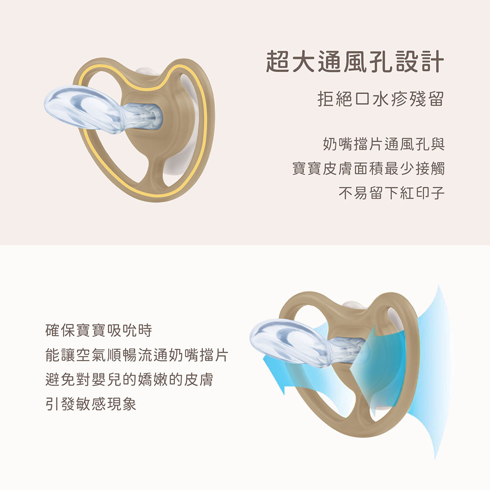 超柔軟材質則能貼合寶寶上顎,超大透氣孔設計,與寶寶嬌嫩肌膚的接觸降到最低,有助於預防口水疹